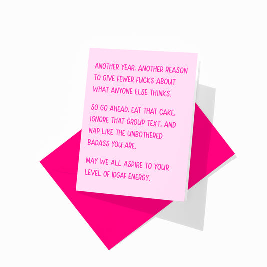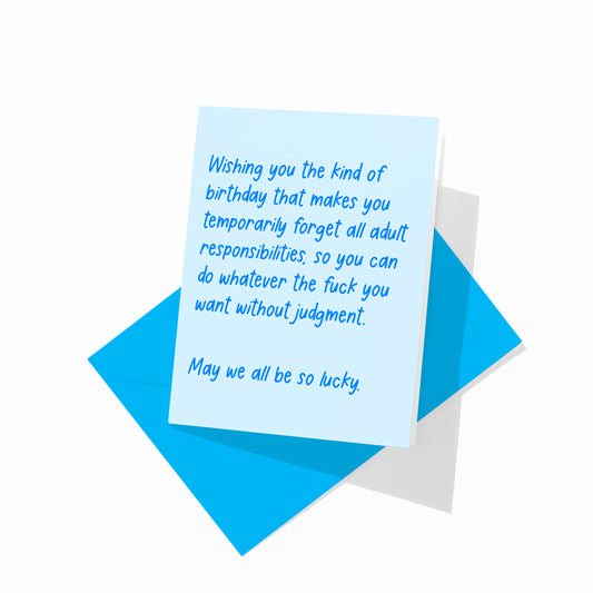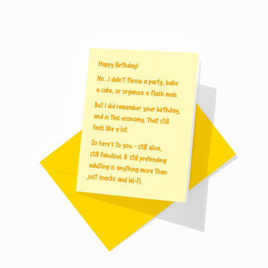 Funny birthday card with snarky adulting humor message on front, blank inside.