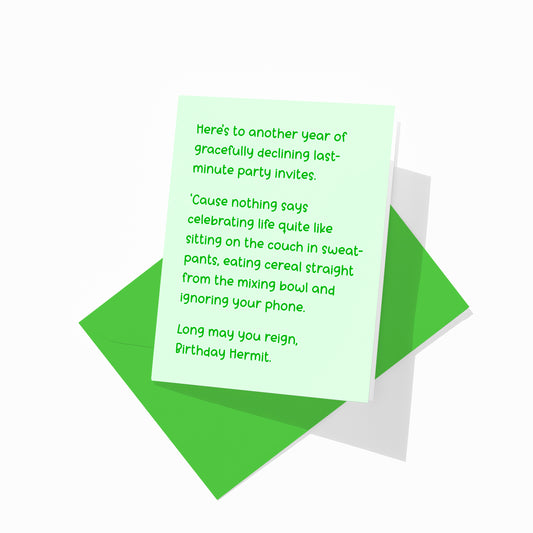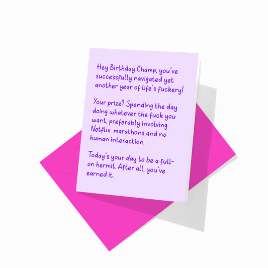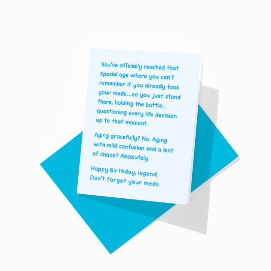 Funny birthday card with witty snarky humor message on front, blank inside.