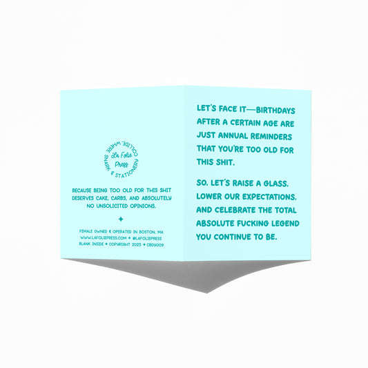 Funny birthday card with adult humor message on front, too old for this shit design, blank inside.