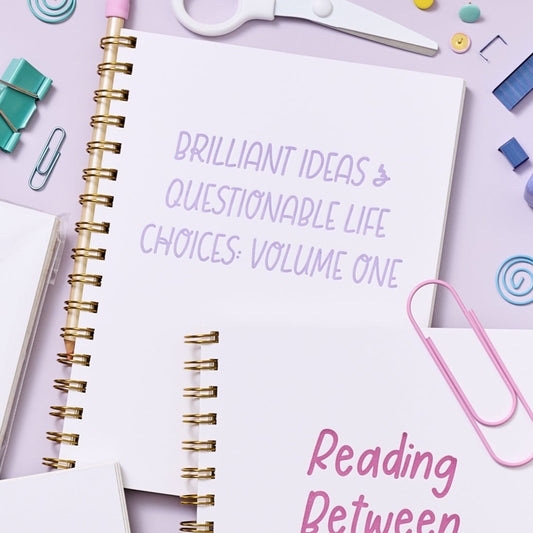 Large letterpress notebook with lavender text “Brilliant Ideas & Questionable Life Choices: Volume One” on white cover with gold spiral binding.