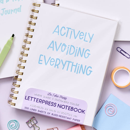 Large letterpress notebook with blue text “Actively Avoiding Everything” on white cover with gold spiral binding.