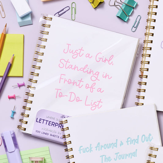 Large letterpress notebook with pink text “Just a Girl Standing in Front of a To-Do List” on white cover with gold spiral binding.