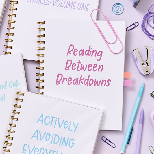 Large letterpress notebook with magenta text “Reading Between Breakdowns” on white cover with gold spiral binding.