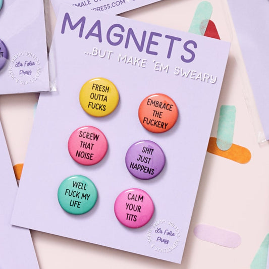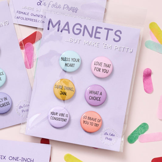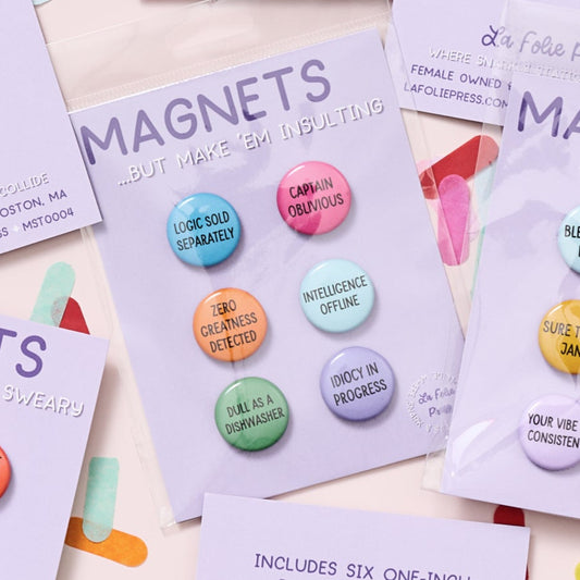 Insulting Magnet Set on backing card with six sarcastic one-inch button magnets