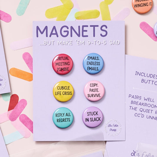 Set of six colorful “9 to 5 Sad” button magnets on backing card with snarky office phrases.