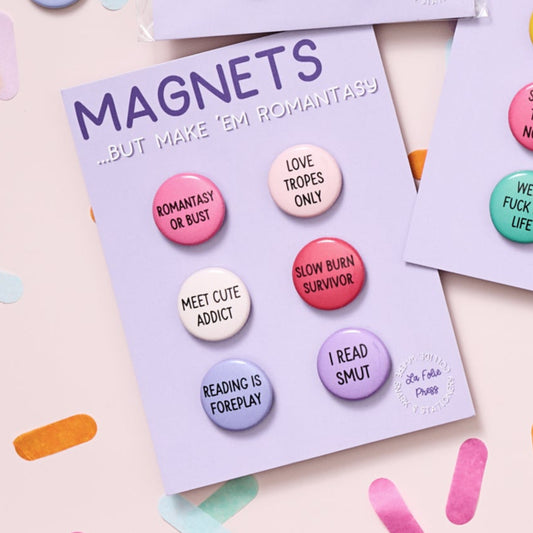 Romantasy magnet set displayed on a purple backing card with six glossy one-inch button magnets featuring funny romance book phrases.