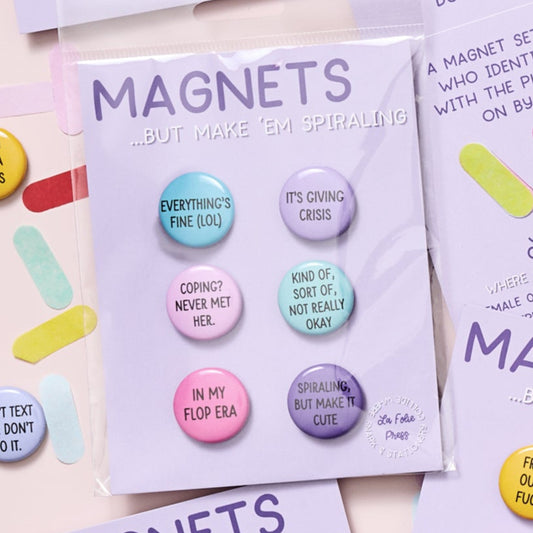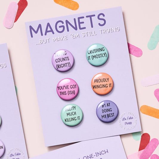 Still Trying Magnet Set with six colorful one-inch button magnets on backing card”
